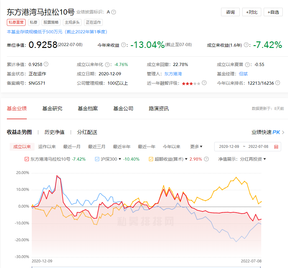 存续管理规模低于500万元的,还有备案于2021年12月21日的东方港湾雪中私募证券投资基金。截至7月11日的最新单位净值为0.9763元,从净值曲线来看,该产品从成立以来净值曲线几乎是一直“躺平”。该产品今年以来亏损2.52%,但是同期沪深300指数下跌11.37%,可谓是躺平跑赢了沪深300指数;另外还有备案于2019年8月27日的东方港湾马拉松17号存续管理规模低于500万元,截至7月8日的单位净值为1.356元,今年以来的收益亏损13.08%。从产品的净值曲线来看,经过前期的躺平之后,近期波动加大。