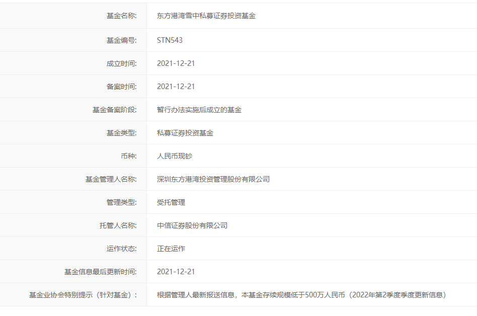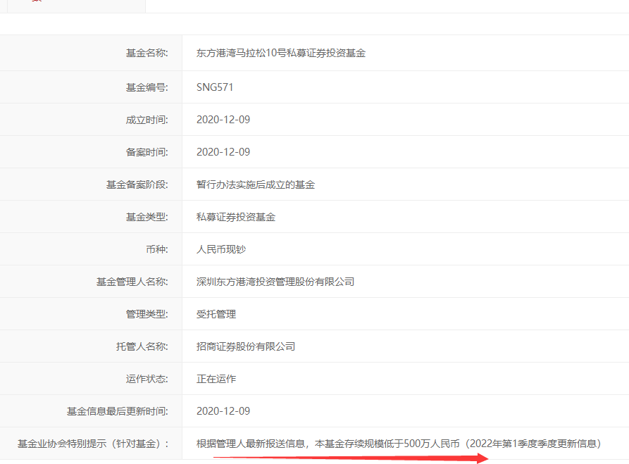 备案于2020年12月9日的东方港湾马拉松10号,存续管理规模同样低于500万元。