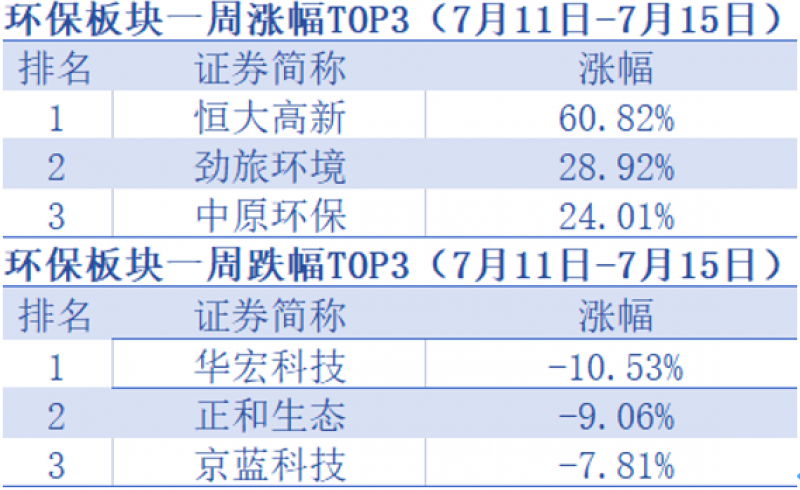 截至本周五(7月15日)收盘,环保板块涨跌幅为0.13%,上证指涨跌幅为-3.81%,深证成指涨跌幅为-3.47%,创业板指涨跌幅-2.03%,环保板块逆势上涨,跑赢大盘,板块内5只个股触及涨停。