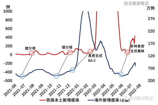 2021年中以来,几乎每轮海外疫情爆发后约一个月,变异毒株都能通过各种方式引致国内疫情的升级。近期海外新增确诊人数有所抬升,且变种病毒的传播力大幅增强。在动态清零政策不变的前提下,或预示着我国未来防疫形势依然严峻。事实上,7月以来,我国疫情波及省市的GDP占比已自6月初20%的低位回升至近40%。