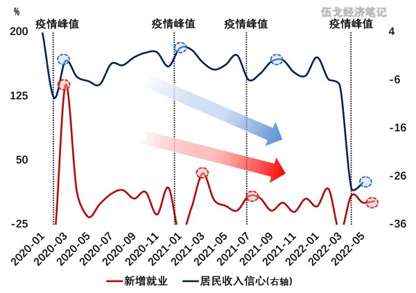 近三年每轮疫情峰值过后,居民的收入和就业虽都有阶段性反弹,但力度已明显递减。疫情多次反复及其管控之下居民预期深度低迷,其资产负债表的长期恶化注定修复的艰难性。二季度居民收入信心指数创历史新低,储蓄意愿则创历史新高。