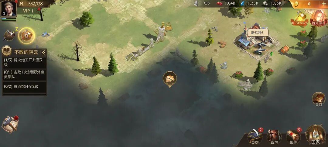 其次,地图上存在许多迷雾区域需要玩家前去探索。通过解锁不同的区域,不仅可以扩大自己的领地,还可以获得对应的建筑以及兵种,增强军队的实力。