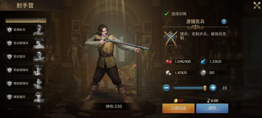 从最基本的“游猎民兵”到“熟练掷弹兵”,再到顶尖的“雷霆掷弹兵”,等级越高的兵种属性越强大,但相应的出征数量也会越少。