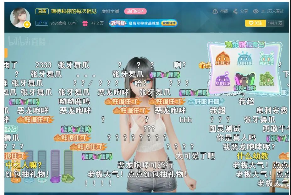 此外,直播间中还能看到很多米哈游其他产品的影子,不只是与其游戏相关的弹幕,直播间的投票器也变成了《原神》中的史莱姆,而这些属性各异的史莱姆也成为了和鹿鸣互动的投票器,观众们通过点击史莱姆表情包来决定和鹿鸣玩什么游戏,鹿鸣还风趣地与观众开着玩笑。半个小时后,鹿鸣离开,只剩下一地挽留。