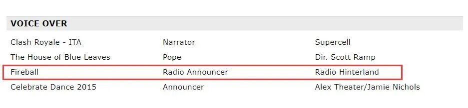 其次,巧合的是(也许并不是巧合),另一位男性演员Marco Virgilio的简历中也出现了“Fireball(火球)”这个项目(目前仍未删除), 他为游戏中的Hinterland电台的广播员配音 。