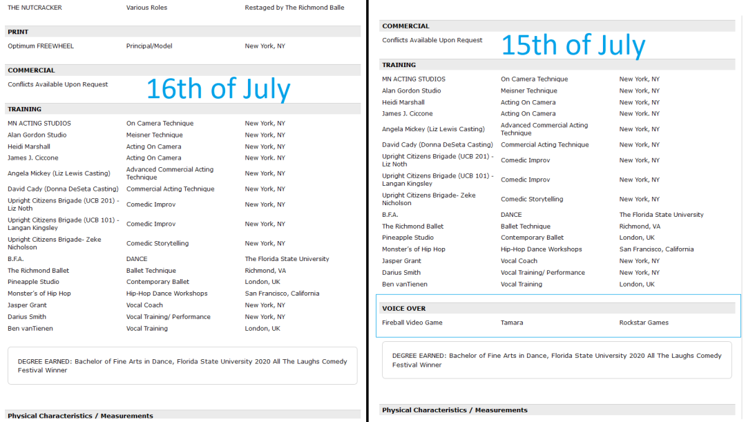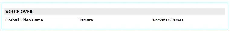 首先,我们看到了女演员Natonia Monet的简历, 她的简历显示正在参与一款名为“Fireball(火球)”的R星游戏的制作,为游戏中的女性角色Tamara担任配音演员(可能就是主角?) 。