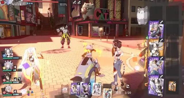 而在战斗系统上,《猫之城》所带来的惊喜,比情绪武装这一设定更多。从设定上来看,《猫之城》的战斗逻辑略显复杂。每名角色都拥有三种技能指令卡,分别是两个常规技能和一个SP技能。当战斗开始时,玩家的指令库会随机补充常规技能,最多可以补充2*5共计10个技能指令。重要的是,当相同的技能指令相邻时,将会自动进行合成升级,最高可以升至三级,等级越高,技能效果越强。在一回合内消耗掉的指令卡越多,理论上收获的战果越大。而消耗卡牌的关键,就是合成卡牌。