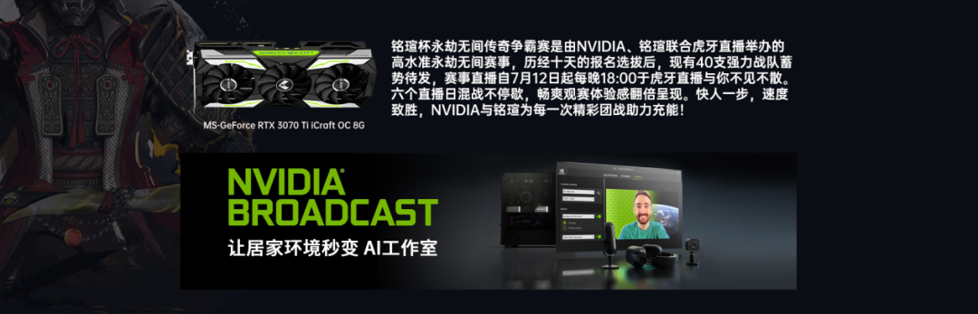 在过去的六个比赛日中,大家不仅看到了大神队伍的高超操作、沉浸体验了永劫无间的华丽激战,更是深刻感受到了NVIDIA DLSS技术和铭瑄显卡的过人之处。在未来,NVIDIA和铭瑄也将继续携手虎牙助力更多精彩赛事,让我们保持热血,共同期待。