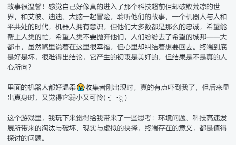 可以说,虽然借助了末日、机器人、高科技、人工智能这些科幻元素的外皮,但《艾彼》的内核仍然是一个传统的情感向故事,给玩家讲述希望的美好和温柔的甜蜜,也成功地赚足了玩家们的眼泪。