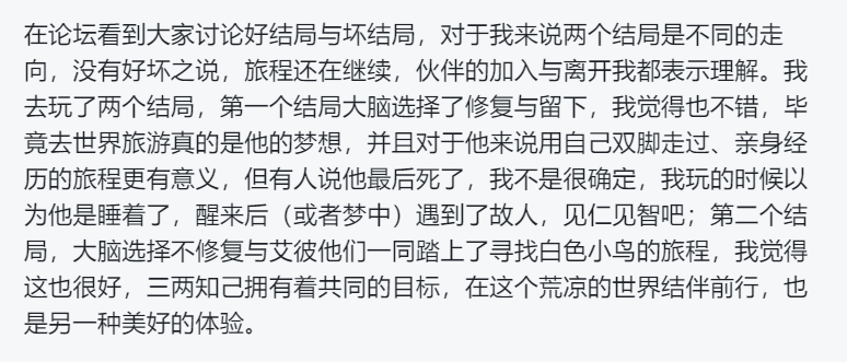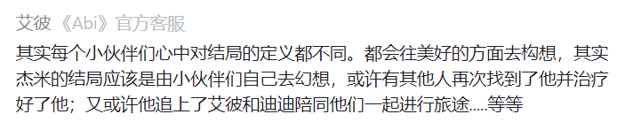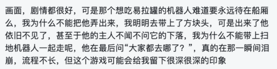 有人纠结于,艾彼和他的伙伴在前进的过程中,没有带其他“有情有义”的机器人一起出发;有人耿耿于怀的是,唯一一个战斗环节的反派boss,明明也是人类“薄情寡义”的牺牲品,自己却只能在它的哭泣中甩下它离开;还有人揪着策划不断追问双结局中,杰米到底会不会死……也许这些细节在游戏的开发过程中只是剧情的小插曲,但却实实在在让不少玩家为之破防。