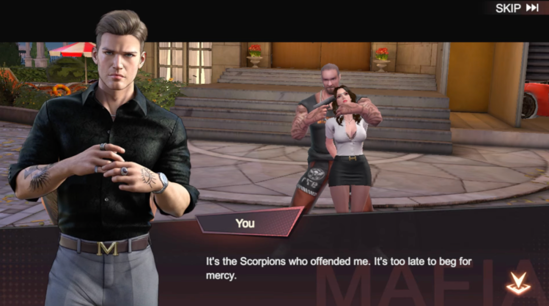 游戏的底层框架为COK-like,新手教程用帮派斗争加以包装,融入PVE闯关和“美女养成”玩法。前者是经典的英雄站桩输出放技能模式,战斗以3D画面呈现;后者是常见的好感养成,随着好感度提升能够为玩家提供包括资源产出、行军战斗等增益。