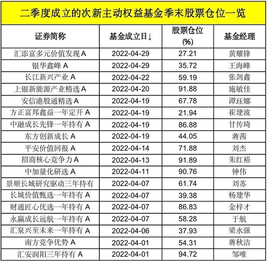 除前述股票仓位加至90%以上的基金外,也有部分成立于二季度的基金投资股票市值占基金资产净值比不到40%,首尾差别较大。