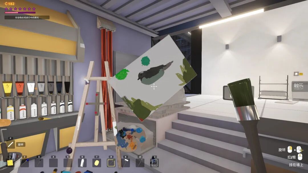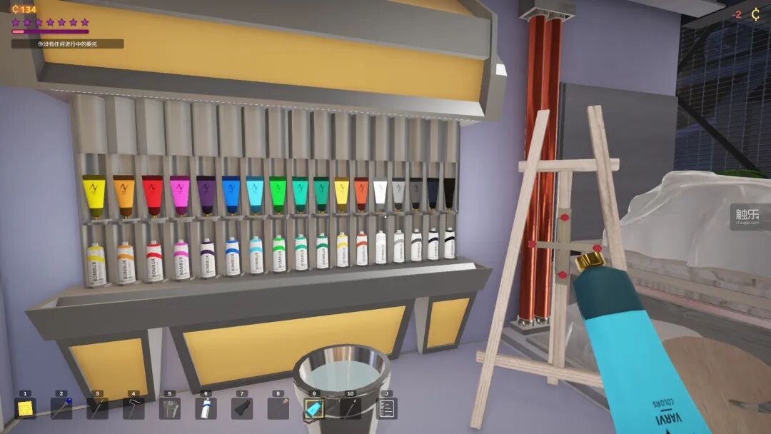 在真正绘画的体验上,尽管混色的逻辑比较粗暴,也很难体会出不同笔刷的效果区别,但游戏还是在尽可能地接近真实的绘画质感——你的笔会在任何触及到的表面留下痕迹。当你完成一幅画作时,画架和旁边的地板、墙壁可能都难以幸免被留下痕迹。相对应的,你也可以用你的画笔尽兴地装饰自己的画室——画成怎样都行!