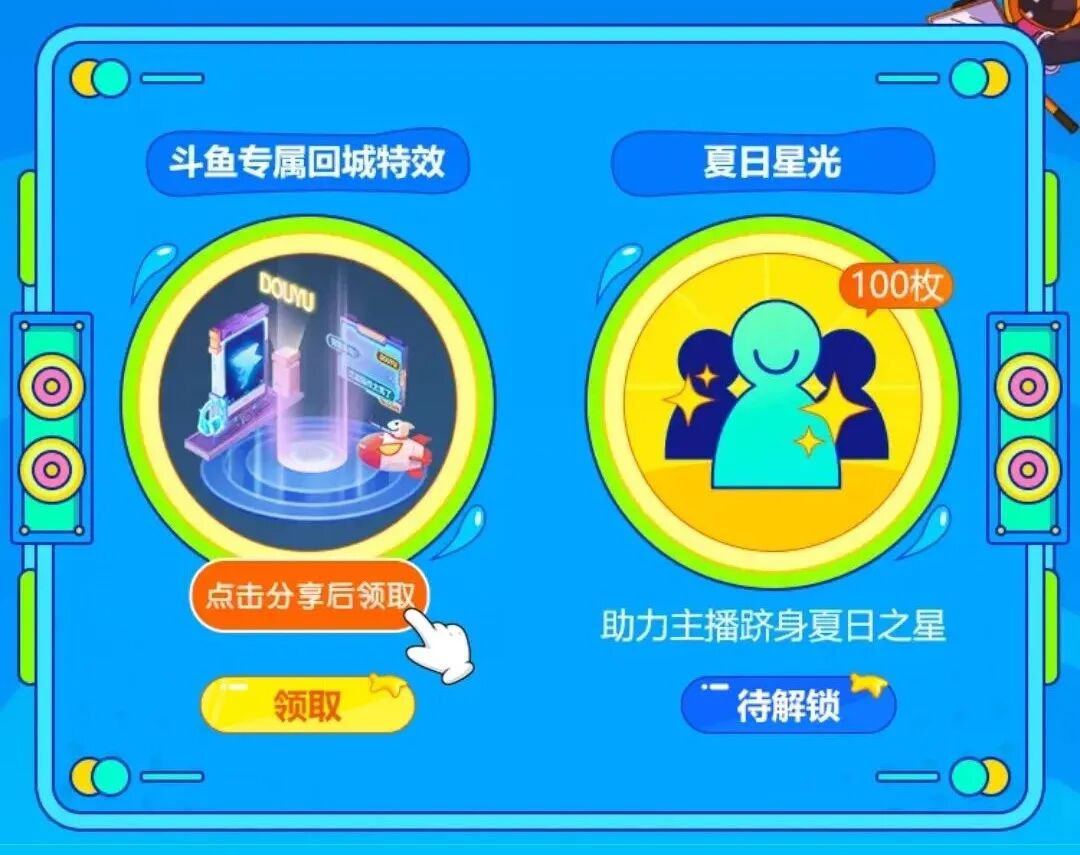 即日起登录斗鱼 app,进入 王者荣耀的直播专区直播专区 “斗鱼回城特效” ,进去活动之后 点击分享 就可以免费 斗鱼定制的专属回城特效 啦。