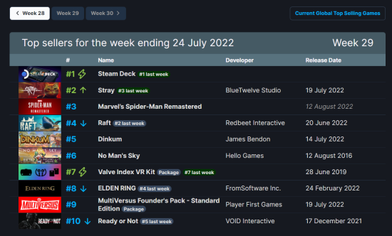 Steam公开了上一周(截至7月24日)的销量排行,榜单第一名仍继续由掌机Steam Deck夺得,本周已经是Steam Deck霸榜的第八周。本周猫猫游戏《流浪》夺得了榜单的第二名。移植作品《漫威蜘蛛侠:复刻版》夺得了榜单的第三名。