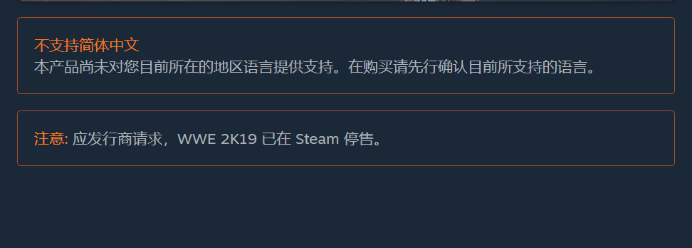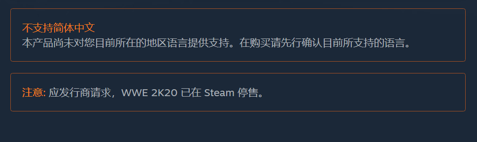 该消息由Reddit用户Popstasia率先爆出,他在决定购买《WWE 2K19》时发现了游戏不能购买,随后发现其他《WWE》都从Steam下架了,但steam页面仍然存在,并注明:“应发行商请求,游戏已在 Steam 停售”。