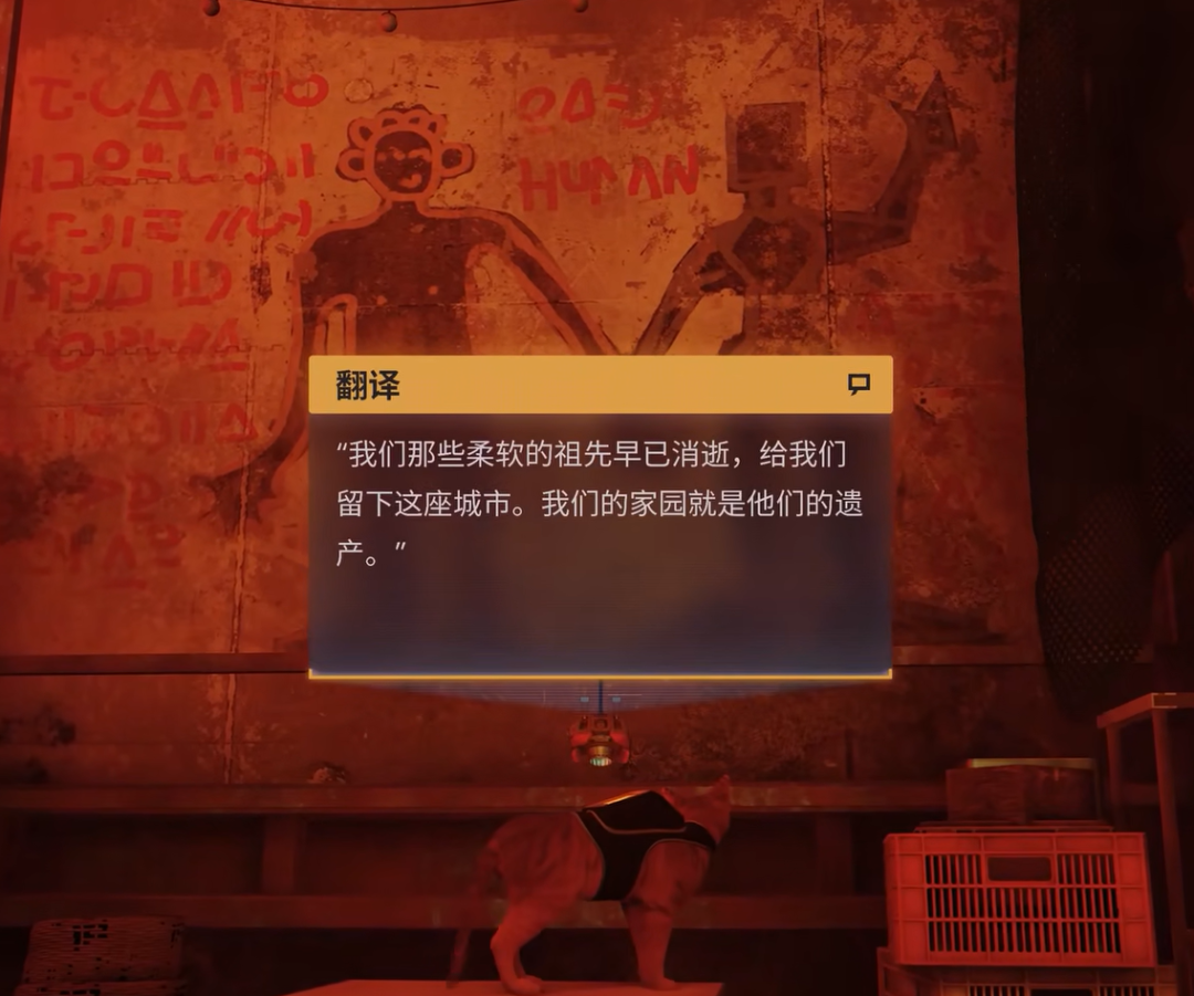 当然,在接下来的流程中,玩家还是会来到一些有其他智慧生命存在的场景,例如建筑破败、生活艰苦的“贫民窟”,极具赛博朋克风格的大型城区“中城”。这些区域是游戏中的定居点,但生活在其中的居民却是用屏幕代替了脸部的机器人。在和同伴的交流中,玩家也得以确认:在《迷失》的世界里,人类早已消失殆尽了。