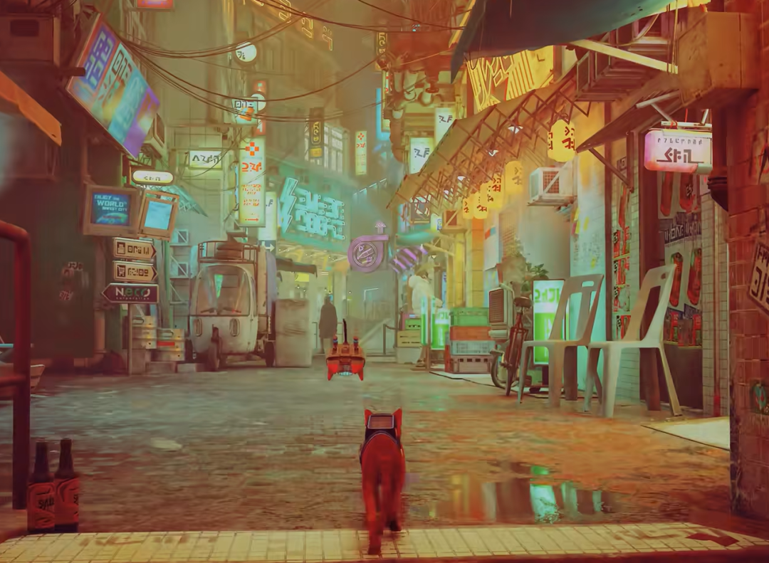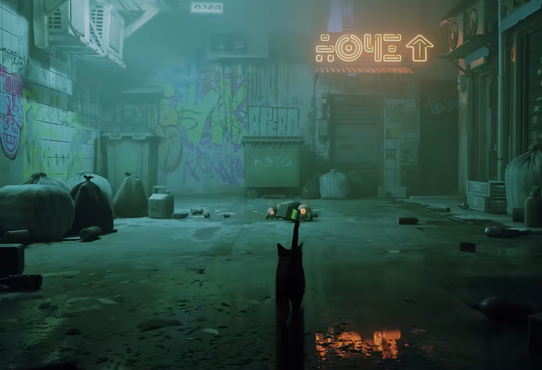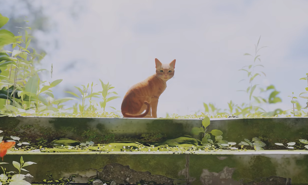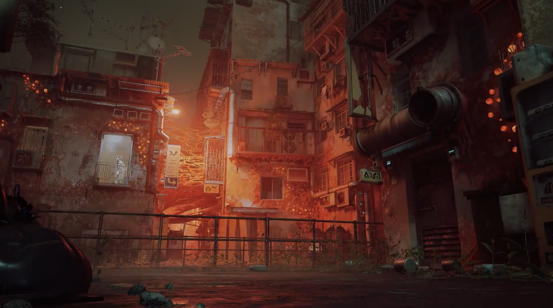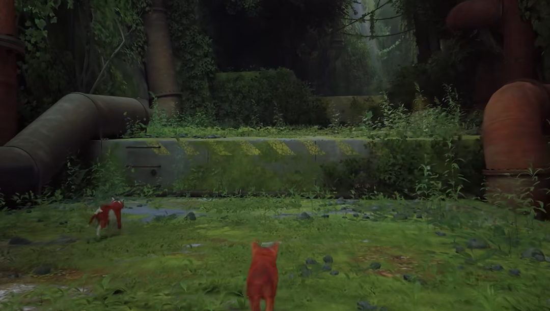 一开始,玩家并没有马上看到充满烟火气的赛博城市,游戏起初展现给玩家的是已经没有人类存在迹象的建筑遗迹。在混凝土和钢铁构筑起来的庞大迷宫里,作为主角的橘猫和其他猫咪结伴而行,沿路只有废弃失修的建筑和设备,被青苔和其他植物逐渐侵蚀,颇有一种“后启示录”的味道。