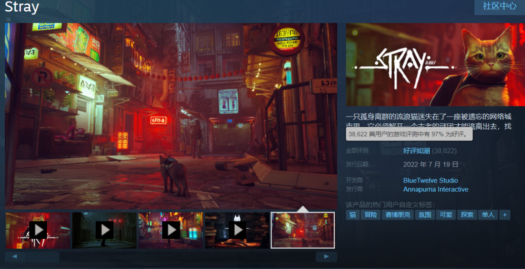 当近年来火热的赛博朋克题材,遇上萌翻全场的可爱猫咪,会发生怎样的化学反应?7月19日,一款由BlueTwelve Studio开发,名为《迷失(Stray)》的赛博朋克新游在Steam和PS平台上线,而这部游戏的主角,是一只误入地下都市的橘猫。