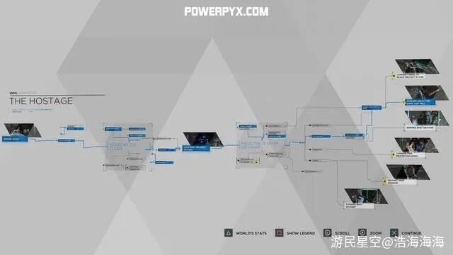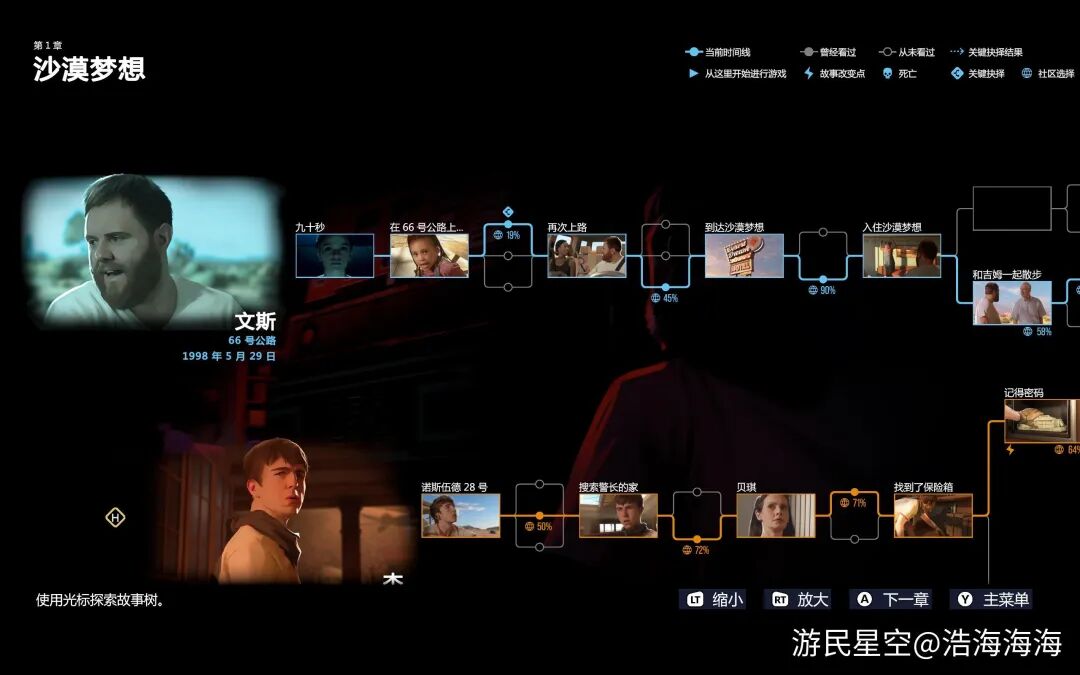 按理说,这类多分支的互动电影很大的一个价值就是可以重复体验其他的选择。很多时候都让人想象如果当时QTE没按对,或者选了另外的选项会发生什么。游戏当然也考虑到了这一点,因此有故事树可供玩家查看,玩家能清晰地看到因为之前做了什么样的选择导致了后面的结果。 但这部分的体验做得较为糟糕,通过剧情树重复体验其他选项的剧情时还要重新又从一个固定点看一遍重复的剧情,不能跳过直接选择,让一周目之后的探索变得很繁琐。