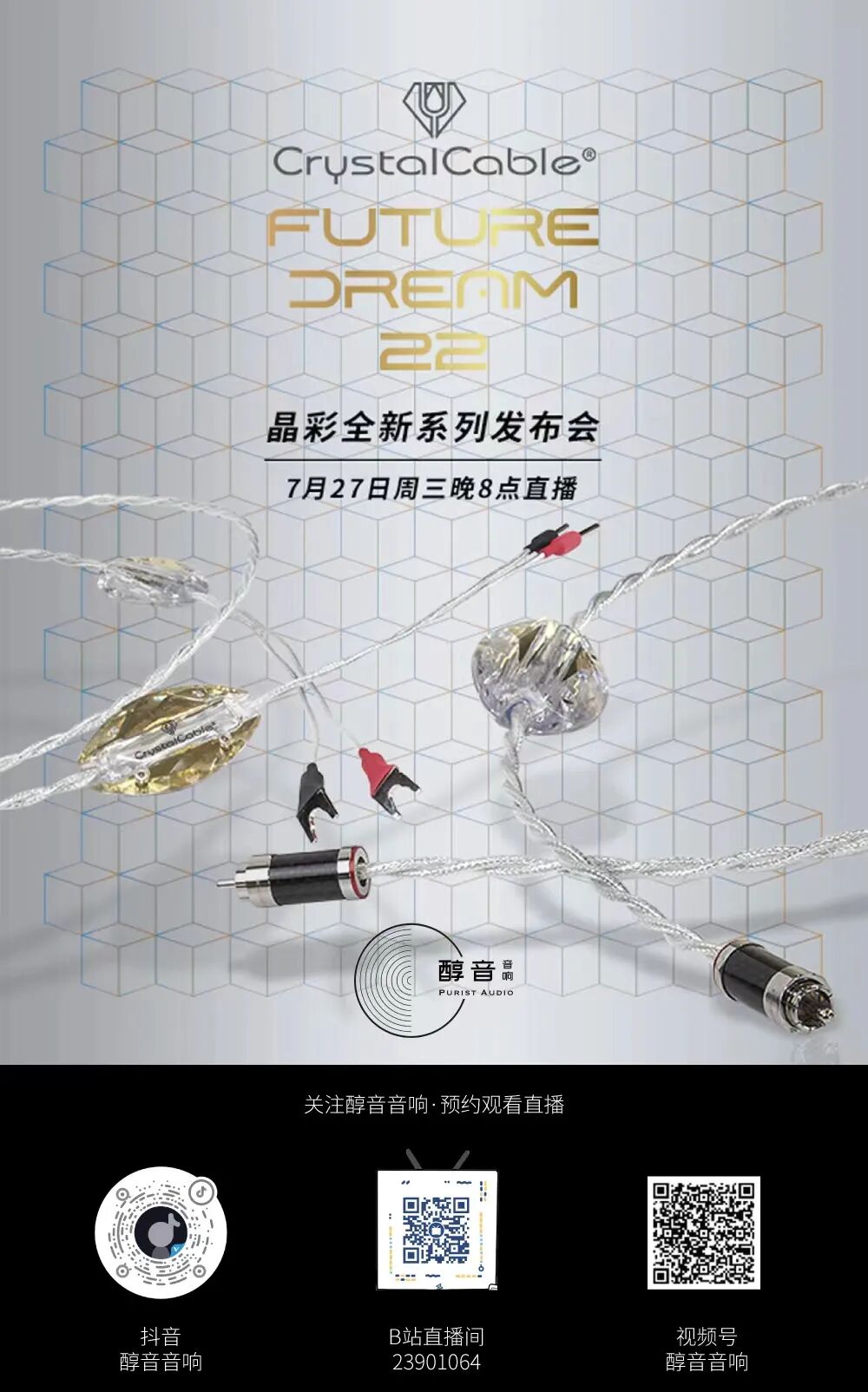 7月27日周三晚(今晚)8点,醇音音响将在 抖音 , B站 和 微信视频号 同步直播Crystal Cable晶彩 FutureDream22 新品发布会。届时,主办方将在 醇音音响 直播间抽出晶彩线材作为奖品。请大家提前关注并预约直播。