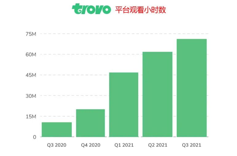 这说明除了视频直播行业在迅猛发展之外,游戏行业本身也在不断贡献更高的话题量、内容和素材。这样一块巨大的蛋糕,自然成了所有厂商关注的焦点,由腾讯投资、在2020年12月正式上线的新平台Trovo,凭借2021年第一季度成为LOL欧美赛区春季赛官方转播平台,飞速积累了大量前期用户,在2021年第三季度时观看小时数达到了7300万小时,环比增加了715%!