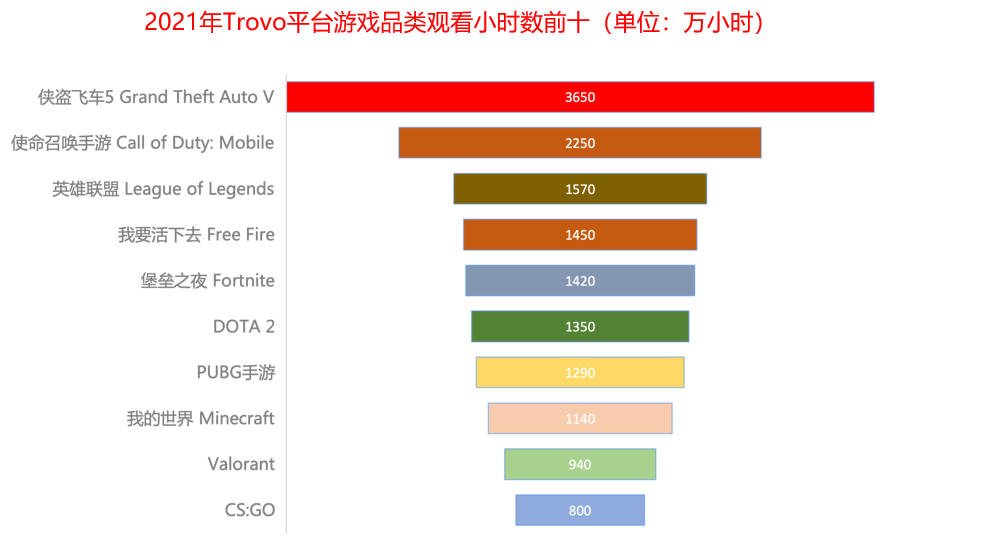 在Trovo平台上,游戏品类的TOP10和Twitch平台也有很高的重合度,值得注意的是, Trovo平台上《使命召唤手游》、《PUBG》手游这两款产品也跻身排行榜前列, 这说明手游受众同样广泛。
