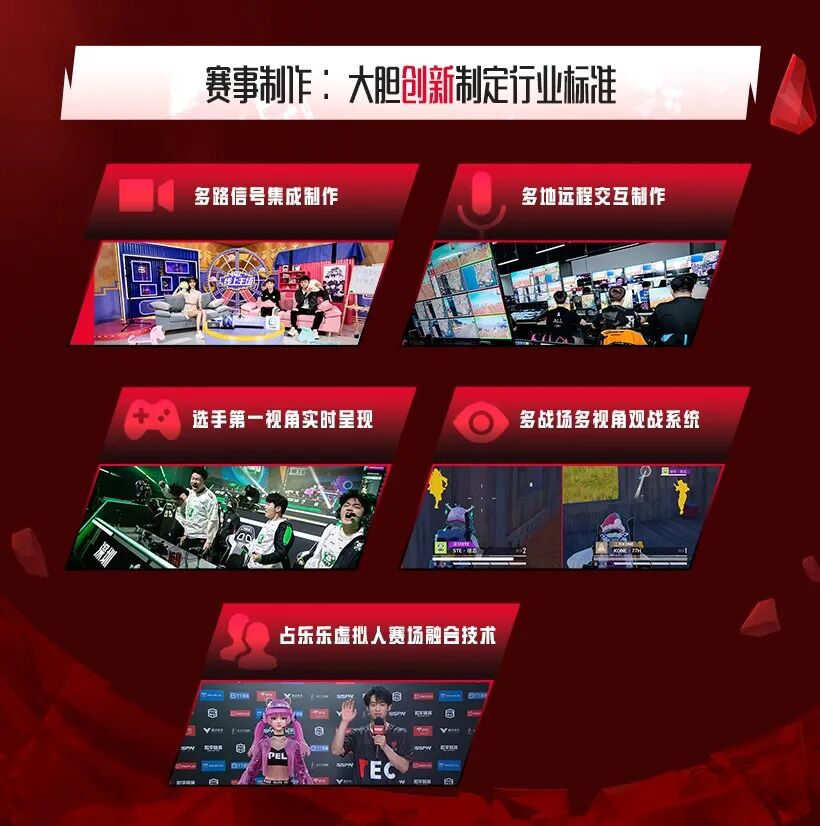 2022年春季赛是PEL众多新“黑科技”的一次庞大秀场,在赛季期间,官方引入了首创的多路信号集成制作、实现零延迟传输直播呈现的“多地远程交互制作”以及基于电竞+体育转播技术的“多战场多视角观战系统”等为移动战术竞技赛事定制的底层观赛系统,并创新性地将一些技术在此前的基础上进行迭代升级,比如选手第一视角实时呈现系统就在原来基础上新增团队视角和语言绑定功能,同时线上主场、虚拟人赛场融合技术也被创新性地引入到赛场中。2023年还将运用多地远程协同新模式,让办赛和观赛都实现全面“云化”,为赛事的全球化发展打下更坚实的基础。