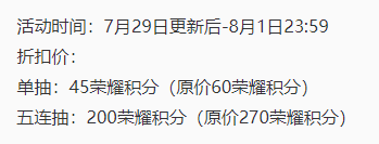 又到了大家很熟悉的夺宝折扣环节,没记错的话今年王者荣耀已经开了很多次积分夺宝折扣了,比往年要频繁许多。单抽只需要 45点 券 , 五连抽是200点券 。折扣时间仅限 7月29日~8月1日 这几天,要抽的小伙伴别错过啦!