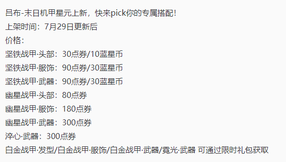这几款星元部件中,除了最普通的 坚铁战甲 可以通过 蓝星币 换取以外, 其他的几款都需要使用点券或抽奖获取。