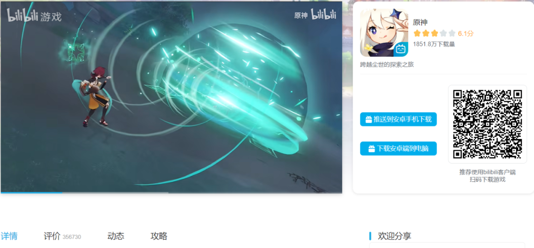 对于同样在打造游戏平台的Bilibili来说,用户流量是长处之一。作为国内最大的弹幕视频网站,B站的用户群体相当庞大,根据2022年第一季度的财报,截至今年3月,B站的月均用户数量已经上涨到了将近3亿人。有了这样的基数,Bilibili游戏平台同样也吸引到了大量用户。以热门二次元游戏《原神》为例,游戏在B站游戏中心的下载量高达1850万,玩家评论超过35万条。