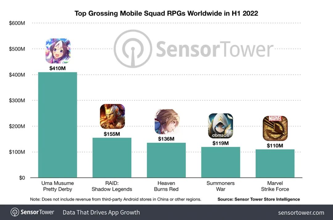 在Sensor Tower统计口径中,Team RPG手游中《突袭:暗影传说》也成为今年上半年第2赚钱的产品,仅次于收入4.1亿美元的《赛马娘》,高于Key社新作《Heaven Burns Red》和老将《魔灵召唤》。