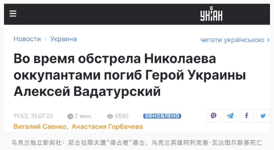 乌南部尼古拉耶夫州州长维塔利·金7月31日在社交平台Telegram上发文称,该州尼古拉耶夫市31日凌晨遭袭,乌克兰农业公司Nibulon总经理阿列克谢·瓦达图尔斯基的家也遭到炮弹袭击,造成瓦达图尔斯基及其妻子死亡。
