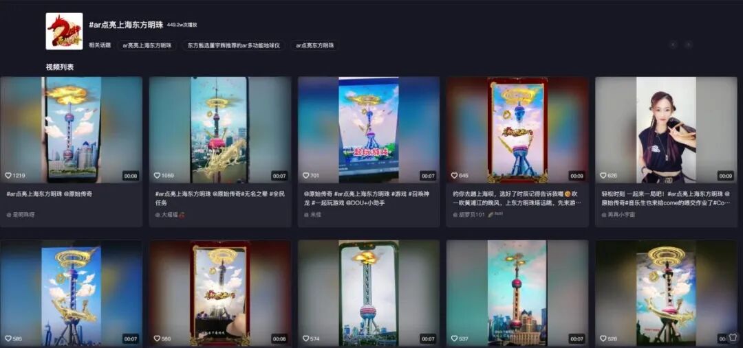 与此同时,官方还首次在抖音平台推出了#AR点亮上海东方明珠的话题活动,玩家可以通过AR扫一扫东方明珠电视塔或《原始传奇》2周年LOGO以视频拍摄的方式参与其中,完成线上与线下的一次特殊“穿越”。