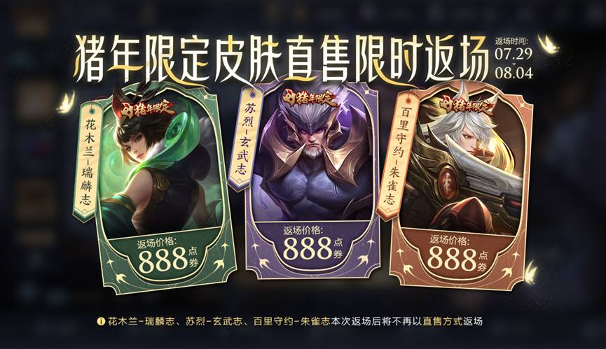 最后再跟大家说下,目前 花木兰、百里守约、苏烈 的三款 猪年限定皮肤 已经在怪客的 王者小店 开启返场了。返场时间为 7月29日~8月4日 ,本轮返场之后,这几款皮肤也不再进行直售返场, 下次要想再入手,就只能等抽奖 了。
