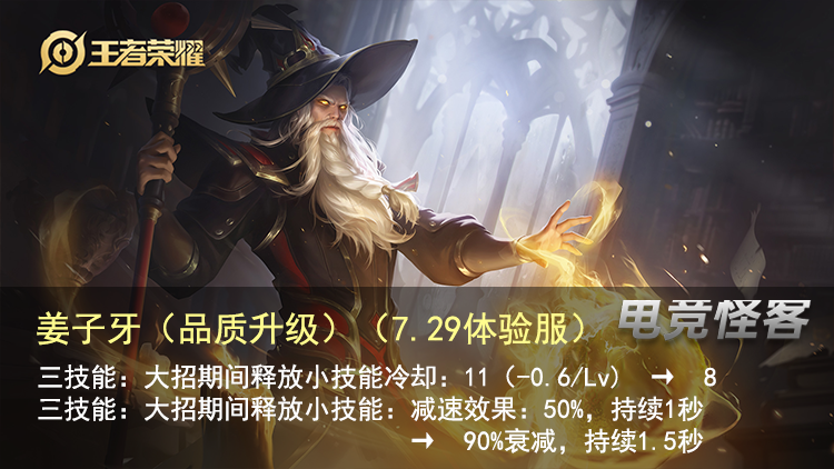 姜子牙在体验服目前已经重做了,最近一共进行了2次调整。第一次是在7月29日,大招释放期间的小技能冷却改成了 固定8s ,并且 大幅度提高了大招期间,释放小技能的减速效果。