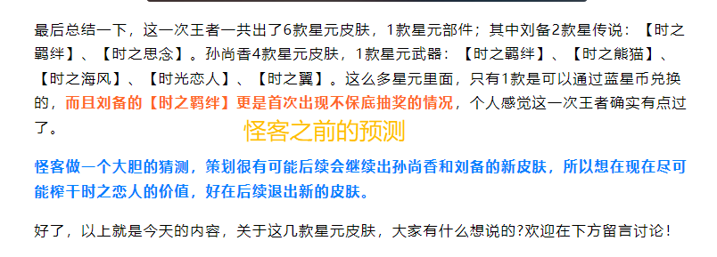 不知道大家还记不记得之前天美一口气出了好几套孙尚香、刘备时之恋人皮肤的星元皮肤?怪客当时就跟大家说, 这是天美为了清库存 , 为两人的下一款情侣皮肤做铺垫。