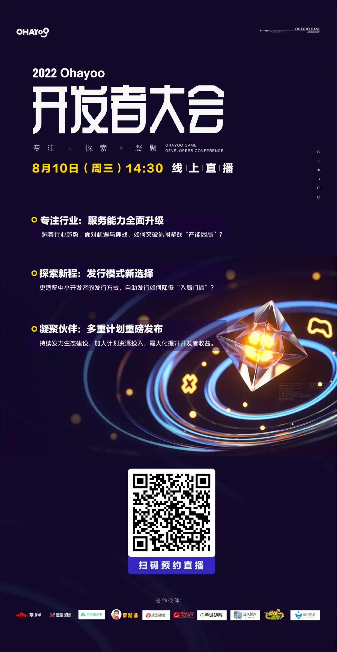8月10日Ohayoo将线上举办2022 Ohayoo开发者大会,通过深度剖析Ohayoo最新业务布局,同时重磅推出多重激励计划,帮助开发者解决发行效率等问题。