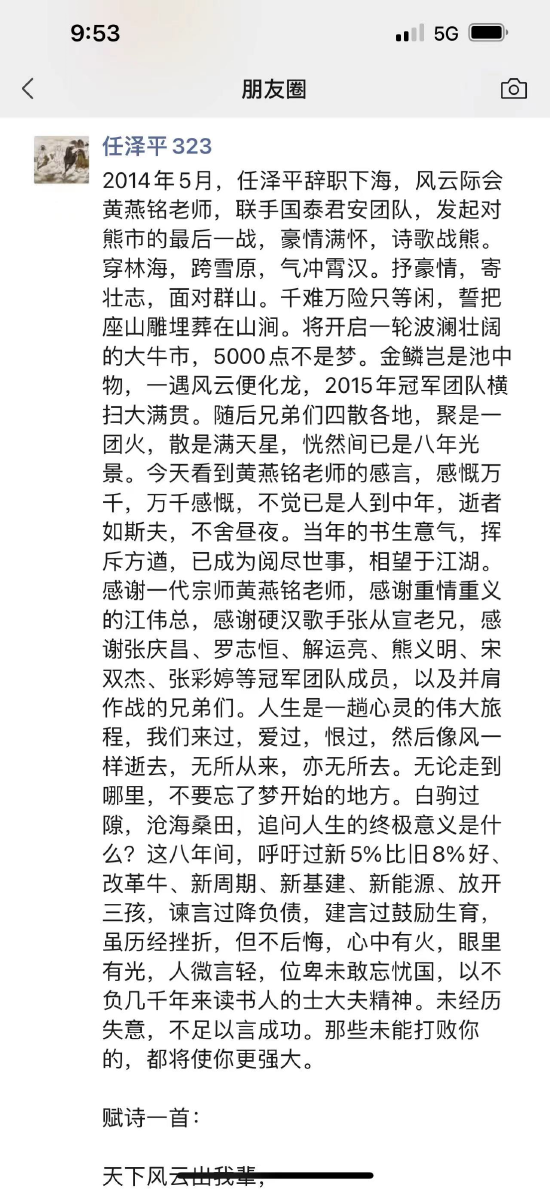 2014年5月,任泽平辞职下海,风云际会黄燕铭老师,联手国泰君安团队,发起对熊市的最后一战,豪情满怀,诗歌战熊。穿林海,跨雪原,气冲霄汉。抒豪情,寄壮志,面对群山。千难万险只等闲,誓把座山雕埋葬在山涧。将开启一轮波澜壮阔的大牛市,5000点不是梦。金鳞岂是池中物,一遇风云便化龙,2015年冠军团队横扫大满贯。随后兄弟们四散各地,聚是一团火,散是满天星,恍然间已是八年光景。今天看到黄燕铭老师的感言,感慨万千,万千感慨,不觉已是人到中年,逝者如斯夫,不舍昼夜。当年的书生意气,挥斥方遒,已成为阅尽世事,相望于江湖。感谢一代宗师黄燕铭老师,感谢重情重义的江伟总,感谢硬汉歌手张从宣老兄,感谢张庆昌、罗志恒、解运亮、熊义明、宋双杰、张彩婷等冠军团队成员,以及并肩作战的兄弟们。人生是一趟心灵的伟大旅程,我们来过,爱过,恨过,然后像风一样逝去,无所从来,亦无所去。无论走到哪里,不要忘了梦开始的地方。白驹过隙,沧海桑田,追问人生的终极意义是什么?这八年间,呼吁过新5%比旧8%好、改革牛、新周期、新基建、新能源、放开三孩,谏言过降负债,建言过鼓励生育,虽历经挫折,但不后悔,心中有火,眼里有光,人微言轻,位卑未敢忘忧国,以不负几千年来读书人的士大夫精神。未经历失意,不足以言成功。那些未能打败你的,都将使你更强大。