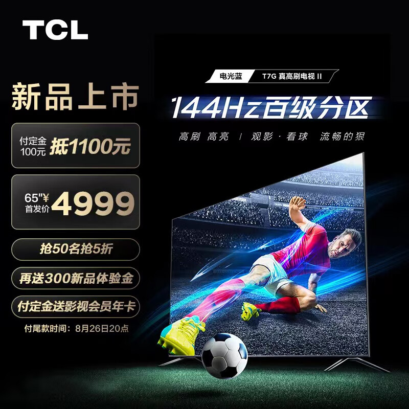 京东 TCL T7G 65 英寸券后 4899 元领 100 元券未经允许不得转载:新聚网 » TCL T7G 电光蓝真高刷电视 II 发布:4K 144Hz 百级分区,首发价 3599 元起