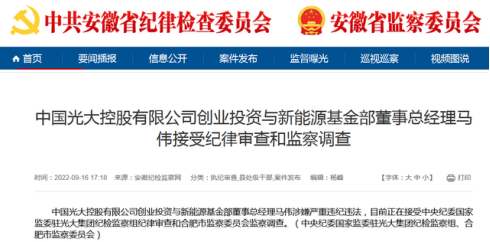 安徽纪检监察网16日通报,中国光大控股有限公司创业投资与新能源基金部董事总经理马伟涉嫌严重违纪违法,目前正在接受中央纪委国家监委驻光大集团纪检监察组纪律审查和合肥市监察委员会监察调查。
