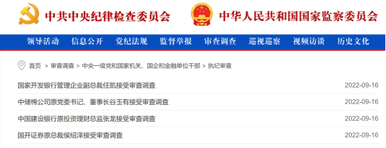 一是,中国建设银行原投资理财总监张龙接受审查调查;二是,国开证券原总裁侯绍泽接受纪律审查和监察调查;三是,中国光大控股有限公司创业投资与新能源基金部董事总经理马伟被查;四是,国家开发银行管理企业副总裁(副职级)任凯被调查。