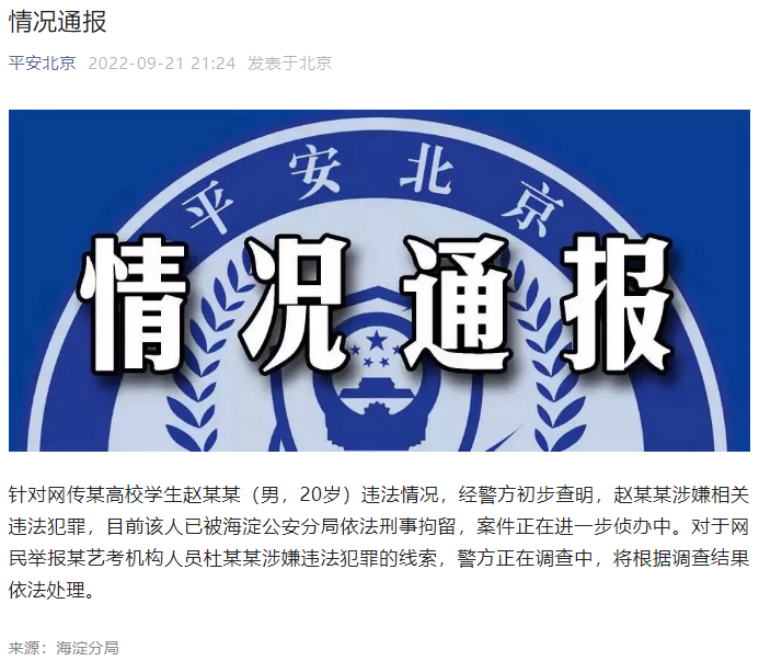 9月21日,北京市公安局官方微信发布通报称,针对网传某高校学生赵某某(男,20岁)违法情况,经警方初步查明,赵某某涉嫌相关违法犯罪,目前该人已被海淀公安分局依法刑事拘留,案件正在进一步侦办中。对于网民举报某艺考机构人员杜某某涉嫌违法犯罪的线索,警方正在调查中,将根据调查结果依法处理。