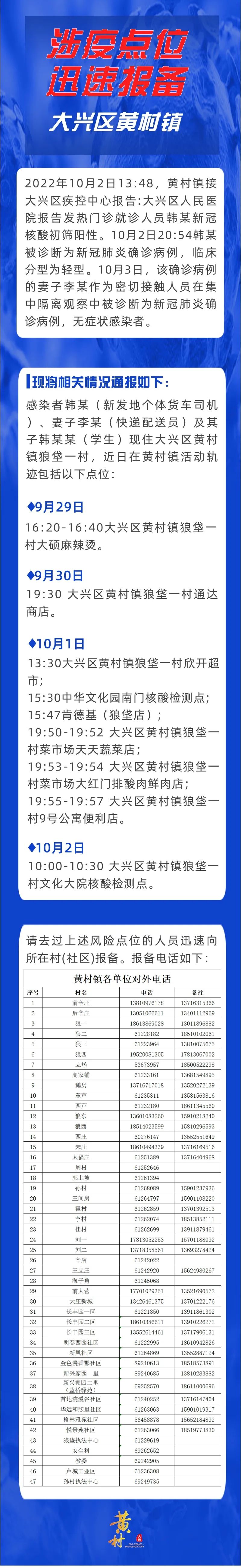 北京大兴黄村镇涉疫风险点位公布,如有到访迅速报备