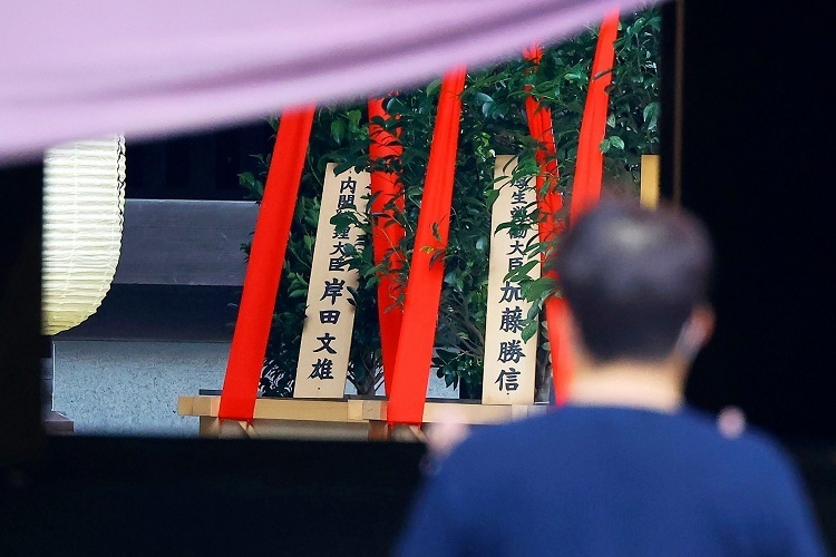 日本首相岸田文雄向靖国神社供奉祭品,东京。10月17日,岸田文雄以「日本内阁总理大臣」的名义向靖国神社供奉祭品,引发韩国、中国强烈不满。韩国外交部发言人对日方供奉祭品深表失望和遗憾,敦促日方正视历史,以实际行动虚心反省过去的错误。中国外交部表示坚决反对日方有关靖国神社的消极动向,已向日方提出严正交涉,敦促日方切实信守正视并反省侵略历史的表态和承诺,彻底同军国主义切割,以实际行动取信于亚洲邻国和国际社会。摄影师:Meika Fujio