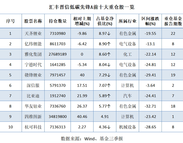 其中,陆彬在三季度选择对天齐锂业、亿纬锂能、宁德时代进行减持,对于赣锋锂业、华友钴业等有色金属行业有所增持,同时被他大幅增持的还有计算机行业的深信服、四维图新,此外,汽车行业的比亚迪也较之上期被增持了21.99%。