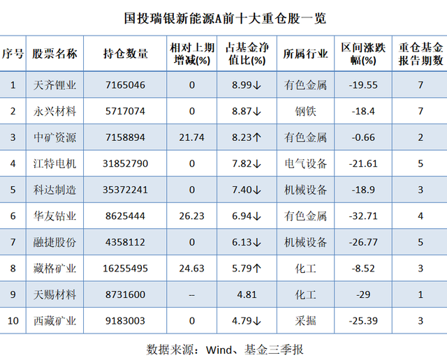 以规模最大的国投瑞银新能源A为例,施成在三季度仍保持较高仓位的运作,股票持仓达88.05%,较上季度末减少了2.92个百分点。从持仓来看,他增持了上游有色金属板块,例如中矿资源、华友钴业等,此外,还增配了天赐材料等。