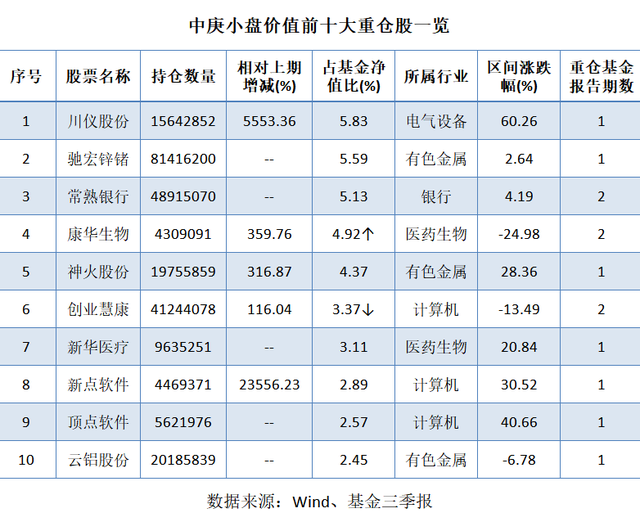 从持仓情况来看,以中庚小盘价值为例,其前十大重仓股有明显的调整,有7只是首次进入重仓标的之列,分别是川仪股份、驰宏锌锗、神火股份、新华医疗、新点软件、顶点软件、云铝股份,而常熟银行、康华生物和创业慧康均是第二次位列其中。
