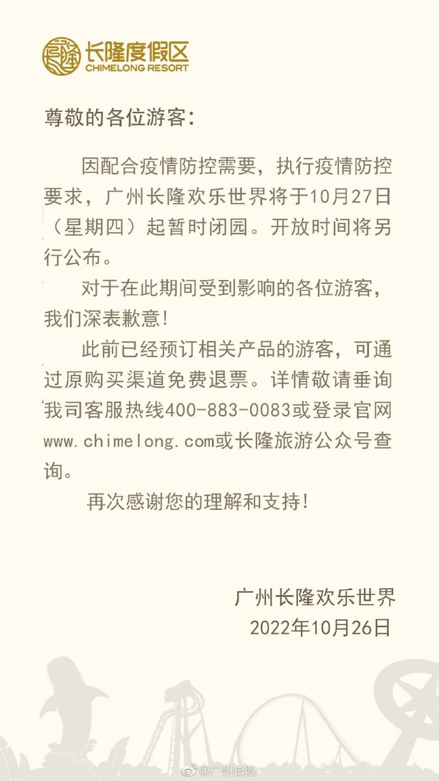 新京报讯 据@广州长隆消息,因配合疫情防控需要,执行疫情防控要求,广州长隆欢乐世界将于10月27日(星期四)起暂时闭园。全文如下: 责任编辑:王蒙 未经允许不得转载:新聚网 » 广州长隆欢乐世界10月27日起暂时闭园