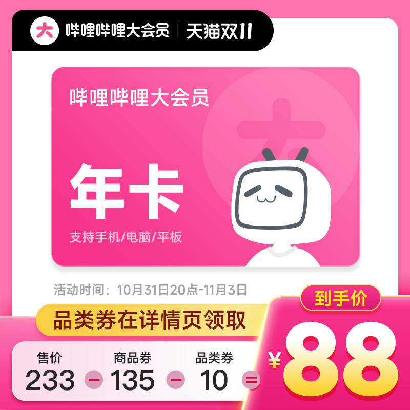 天猫 bilibili 大会员年卡商品详情页领 10 元补贴券券后 88 元领 135 元券QQ 超级会员 年卡日常 240 元,本次大促 110 元(4.58 折):